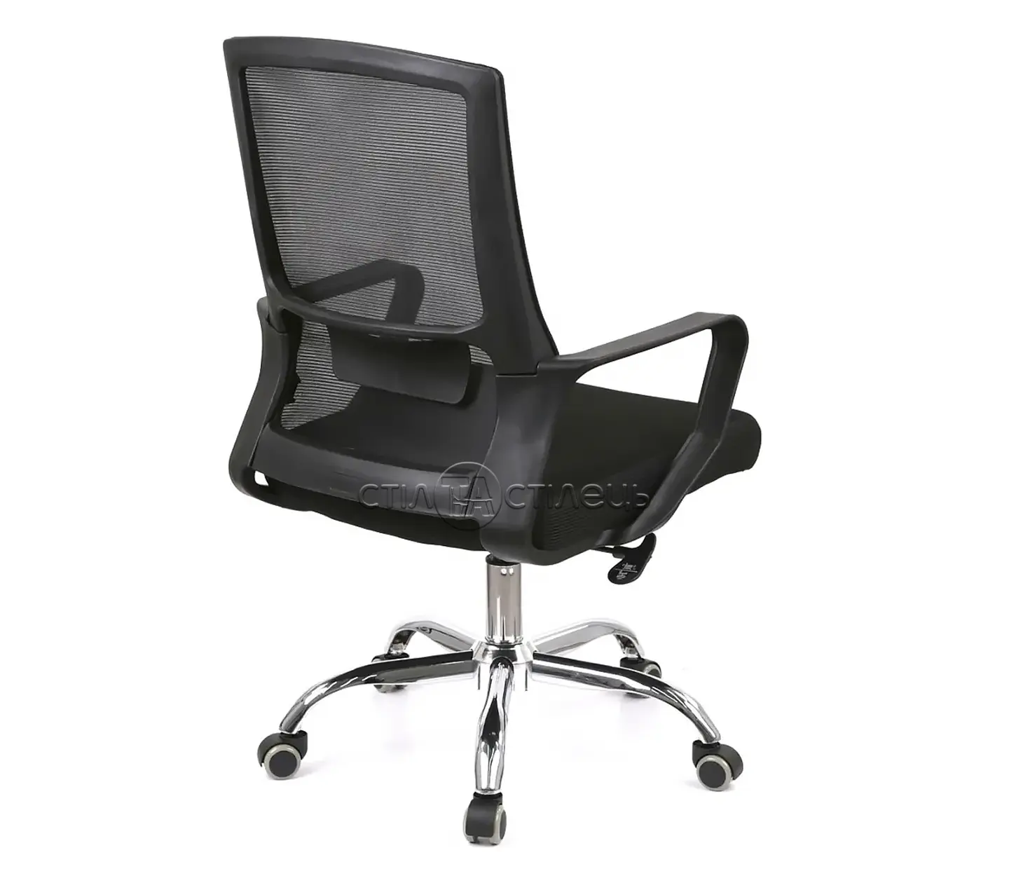 - Спинка виготовлена із міцного чорного пластику, на який натягнута сітка – таке рішення просто безпрограшне: тканина добре пропускає повітря та чудово підтримує спину за рахунок своєї еластичності.